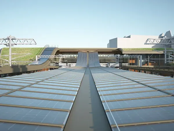 La gare sera équipée de panneaux photovoltaïques, d'un toit végétalisé pour la gestion des eaux de pluie et d'habitats pour la faune, conformément aux objectifs de la ville en matière de biodiversité et de neutralité carbone. La conception accessible de la gare réduira le trafic automobile local de plus de 1 100 passages par jour et encouragera les options de transport durable, améliorant ainsi la qualité de l'air et la qualité de vie dans la région.